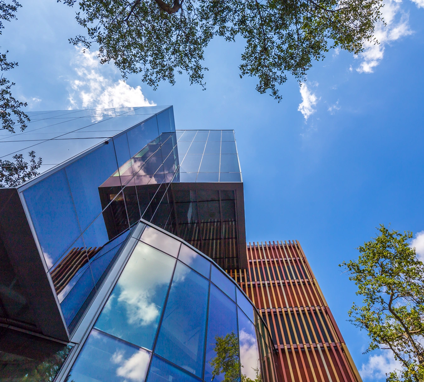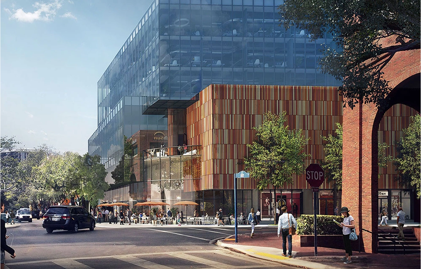 The five-story parking garage that originally occupied the site was adapted to create a mixed-use complex with outdoor cafés, restaurants, and street-level retail, as well as three floors of Class-A offices. The corner is set back with an upper balcony to create a void so that the facade unfolds and draws the eye upwards.