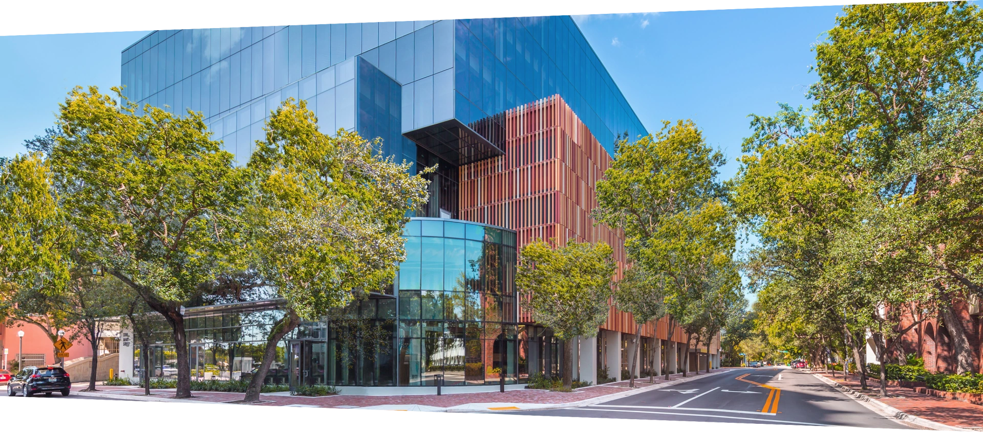 Conceptually, Mary Street was designed by Touzet to activate an otherwise static corner in a quiet area of Coconut Grove. The desire was to create engaging forms and textures that would capture the attention of passing pedestrians and drivers on the well-traveled street corner. Visual inspiration came from the patterns of the Dellesert’s Lyria seashell, whose spiraling structure is noticeable for its reddish-orange ribs that resemble the strings of a lyre. Those same natural patterns have been approximated and re-interpreted with a grille of hollow terracotta ribs on the building’s exterior that alternate in tone from reddish-orange to paler sand-colored hues, set in random order on an aluminum frame that wraps around two sides of the building.
