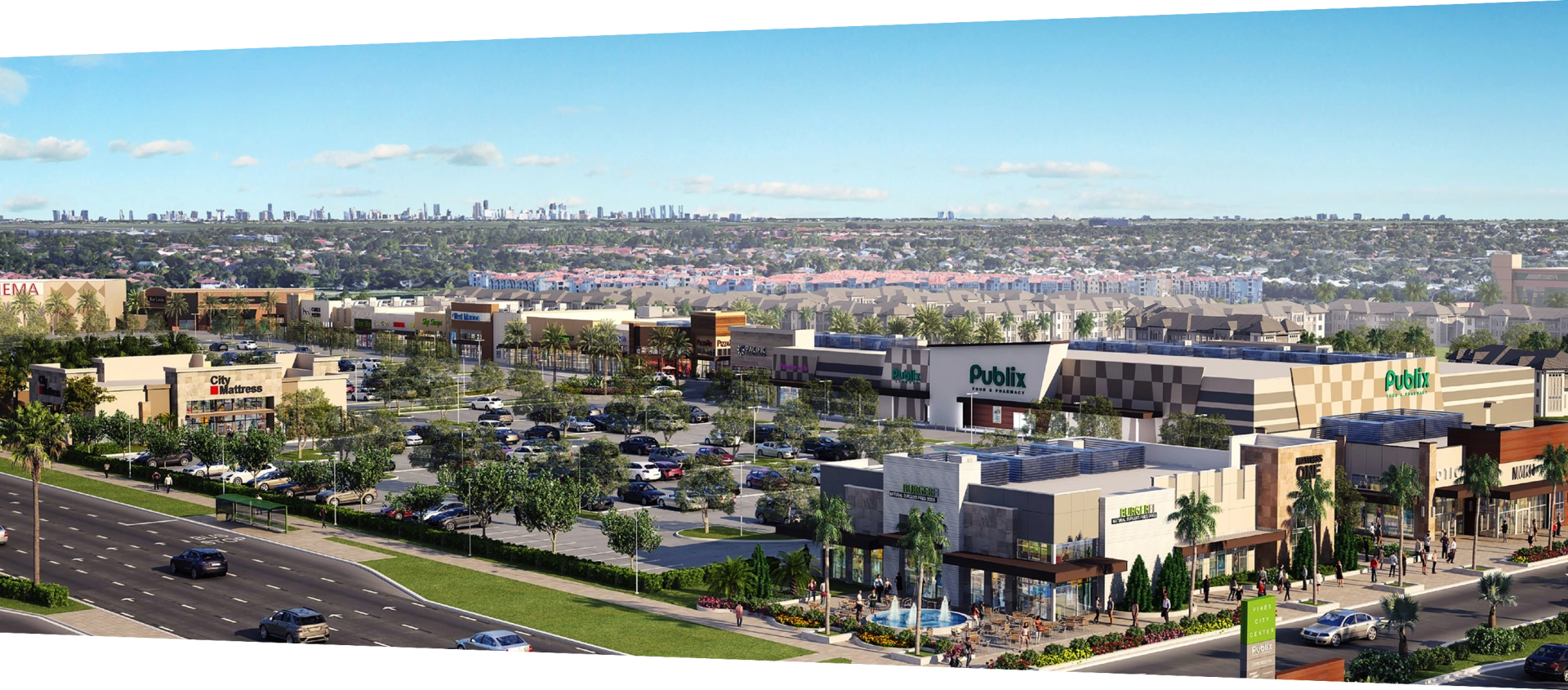 Retailers and high-quality restaurant tenants are attracted to Pines City Center for its combination of civic, entertainment, commercial and residential uses in a vibrant market area that draws visitors from both the immediate neighborhood and across South Florida. Located on the north side of Pines Boulevard at Palm Avenue in Pembroke Pines, Pines City Center totals approximately 300,000 square feet of retail, restaurants, and entertainment with anchor tenants like Publix and Hobby Lobby, along with a mix of food and beverage operators. These establishments were vital in creating a center that has become an everyday destination for Pembroke Pines’ fast-growing community.