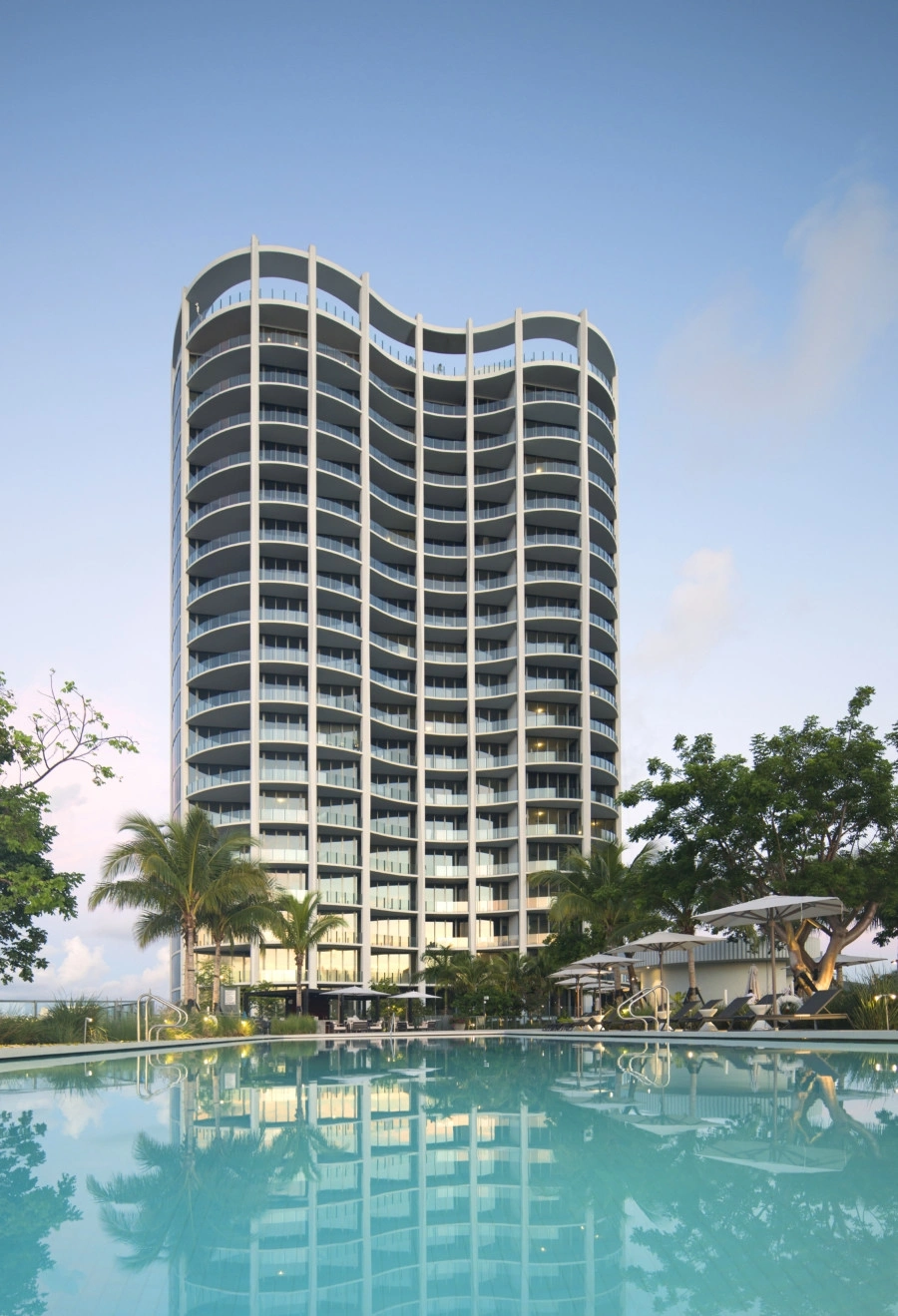OMA’s Park Grove in Miami is defined by its buildings’ sinuous envelopes that provide shading, privacy, and framed views. The development’s constituent buildings share some spaces, like a pool and landscaped areas.