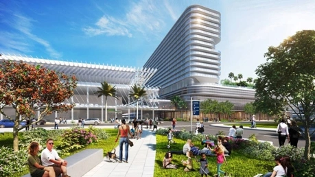 The newest proposal, created by Turnberry’s Jackie Soffer, Terra Group’s David Martin, Miami Design District developer Craig Robins and architecture firm Arquitectonica, features a 185-foot tall, 800-room hotel connected to the Miami Beach convention center via a pedestrian bridge. The facade includes a 53-foot podium with two taller wings of hotel rooms stretching behind.