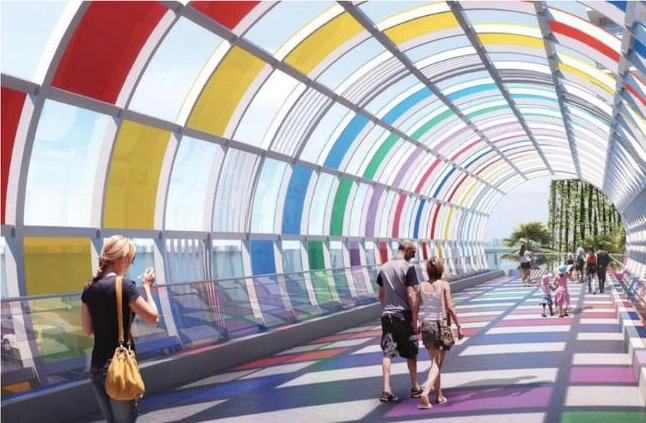 Arquitectonica is to return to the city commission in September with additional design details for Mr. Buren’s vision. Architects focus on lighting the bridge in the evening with LED lighting to allow the glass panels to cast colorful shadows in the evening.