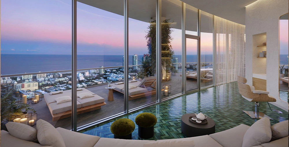 The 48-story residential tower consists of 98 condos with spectacular ocean, bay, and park views, pools, private dining rooms, a library, units for guests, indoor and outdoor gyms, a dog park, jogging paths, and a playground.