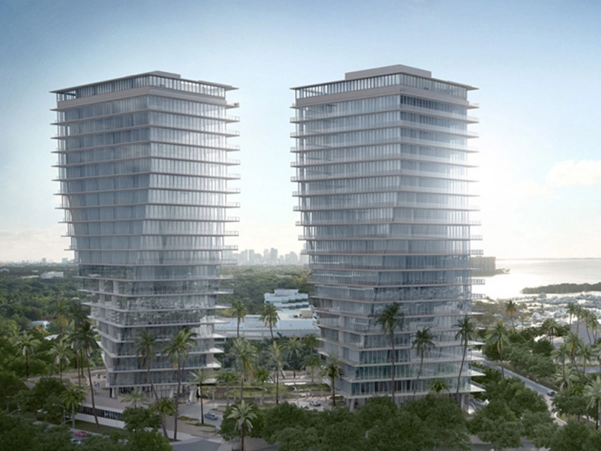 A pair of twisting 20-story towers by Bjarke Ingels make up the 98-unit Grove at Grand Bay condominium project, set to be completed by Miami developer Terra Group by the end of the year. Located in Coconut Grove, the buildings will feature 12-foot ceilings and panoramic views of the nearby marina. Amenities include five pools (including two on the rooftop_, a pet spa service, a fitness center, and an art gallery.