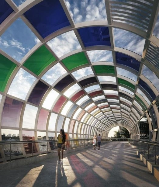The project dubbed “The Miami Beach Canopy" and subtitled “Walking Under, Along, and On The Colors” was designed by French artist Daniel Buren. Sunlight would filter through the panels, creating a kaleidoscope of colors inside the enclosure. Openings in the top of the structure will allow for ventilation. A sign for Miami Beach would line the lower part of the bridge.
