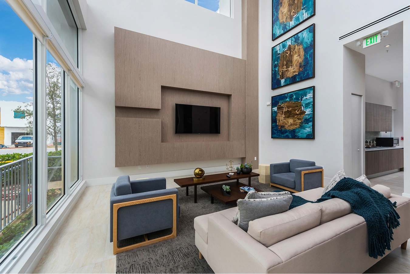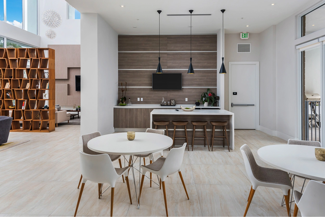 The three Modern Doral Clubhouses were designed by V-Starr and reflect quintessential attributes of mid-century Miami design such as sculptural lighting, playful artwork, wide-open floor plans, and bright pops of color.