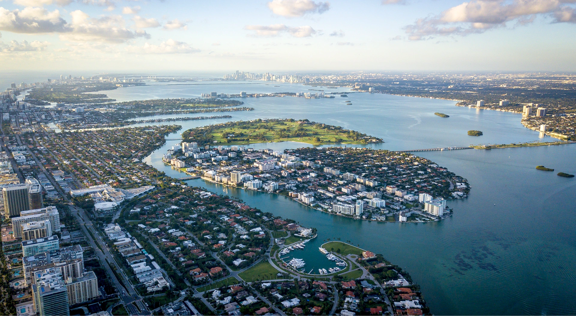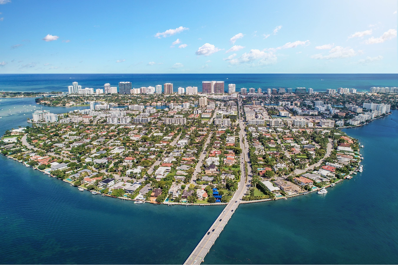 This two-island community in Biscayne Bay is distinguished by mid-century modern homes with a Miami twist and multifamily buildings. The lushly-landscaped business district Kane Concourse features iconic modern sculptures, galleries, and professional offices.